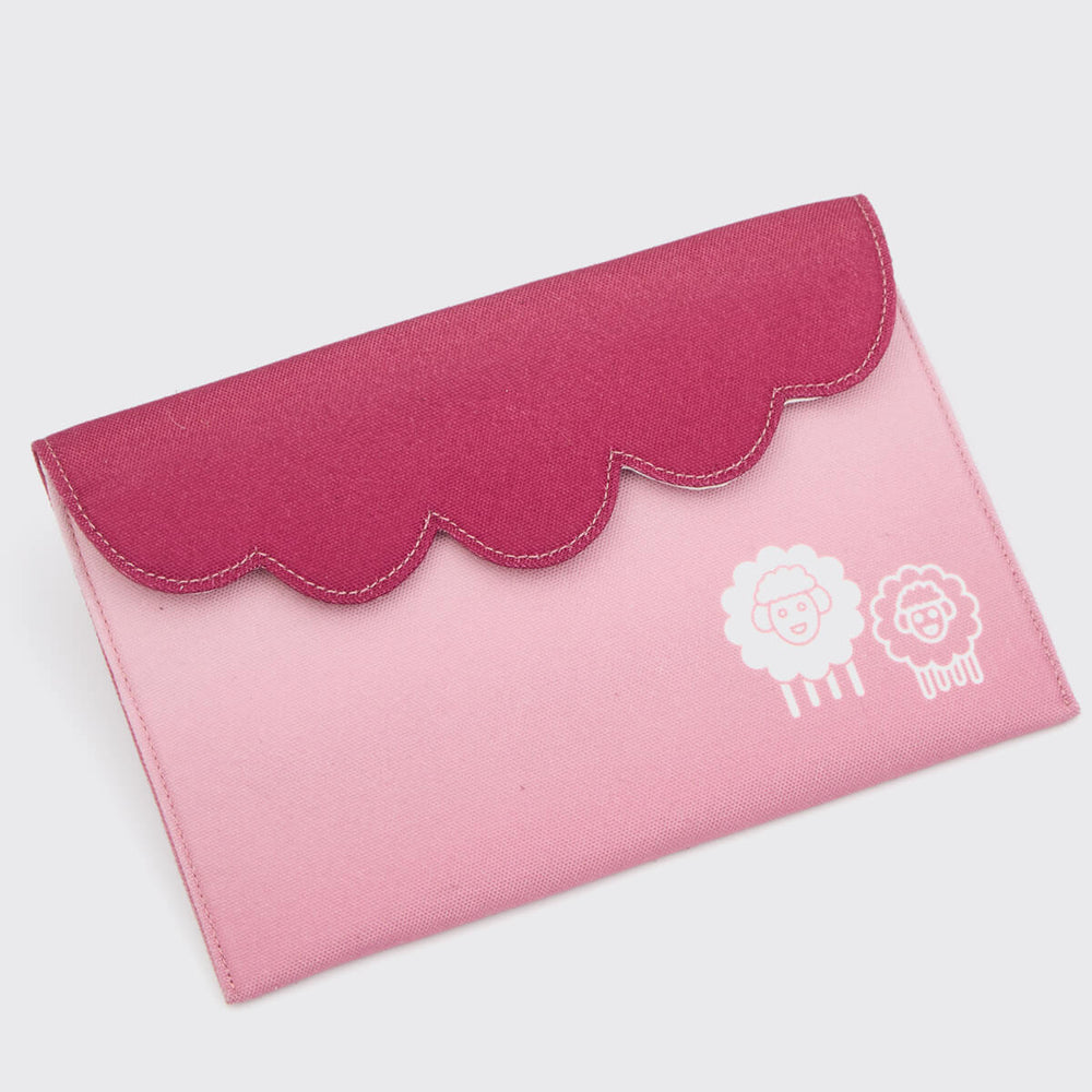 Alle Komponenten sind in einem schicken Bordeaux-Stoffetui mit bezaubernden Schafmotiven aufbewahrt – praktisch und tragbar zum Stricken zu Hause oder unterwegs.